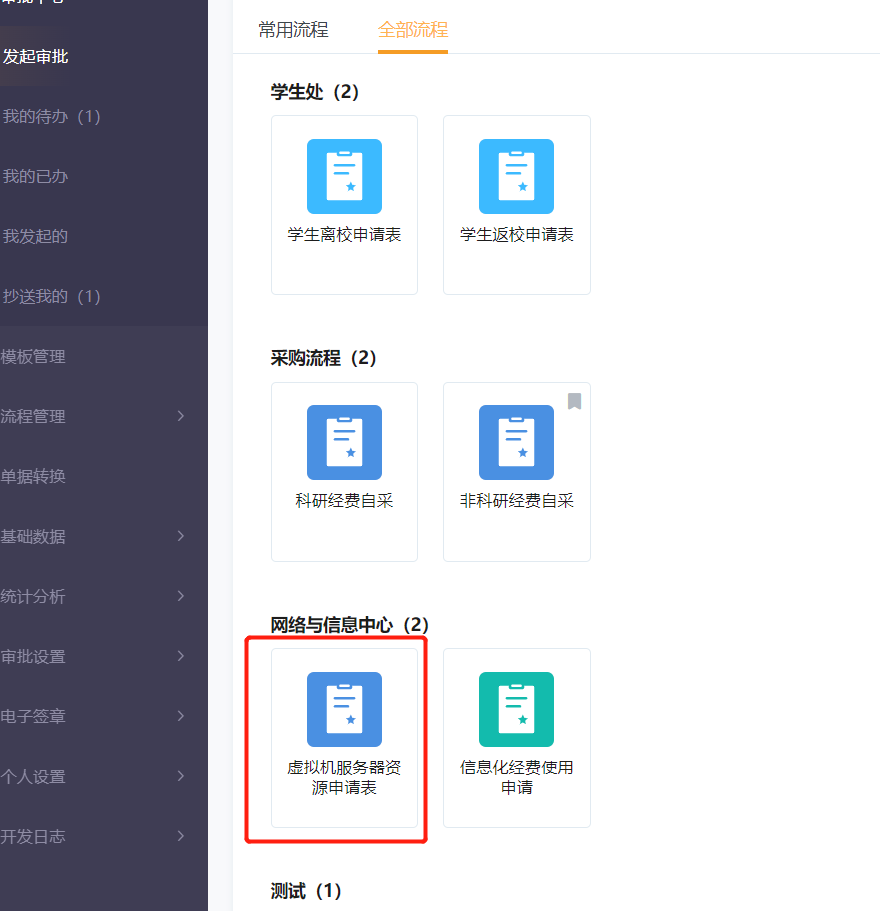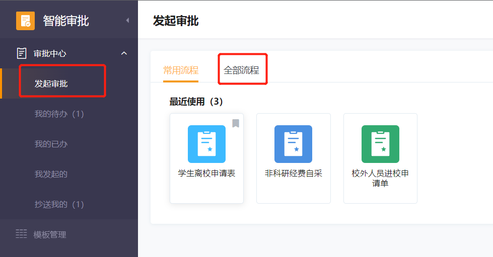 第四步 点击【发起审批】,如果您是第一次使用智能审批系统,请继续点击【全部流程】